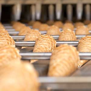 La solution de traitement de mini cônes comprend principalement un système de battage, un système d’injection, un système de cuisson, un système de laminage, un formage, un agencement de transport, etc. Elle peut être équipée d’une remplisseuse pour réaliser des cornets en chocolat, des cornets à la crème et plus encore.